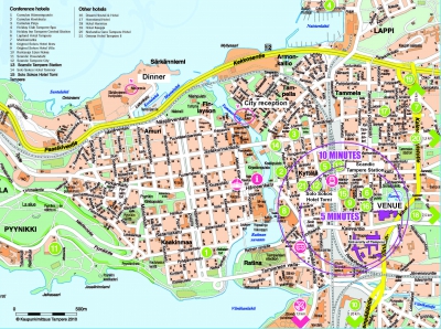 Participants have a possibility to book hotel rooms for special price from Scandic Tampere Station Hotel or Solo Sokos Hotel Torni Tampere. Hotels are wihtin a walking distance from Tampere Hall. You can click the picture and view the map larger.